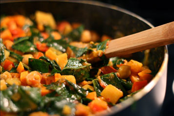 Place the peppers, carrots, and onions in coconut oil until softened. Clean and chop up the spinach. Pour everything into a pan and stir in the chunky peanut butter. Mix until it coats the veggies evenly. While on medium heat cook down the spinach, then stir in the coconut milk, salt, and pepper. You can continue cooking to dry it out or serve it wet.