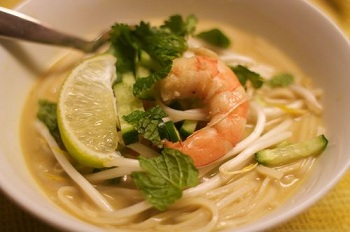 Just before serving, add the shrimp to the broth and gently simmer until they're just cooked through, about 3 minutes. Ladle the hot soup over the noodles. Arrange a mound of the cucumber and bean sprout mixture in the center of the bowl, top with a lime wedge, and serve immediately.