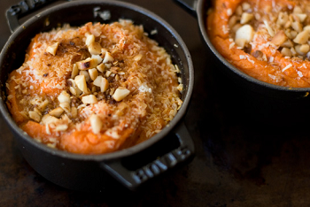 Wrap each sweet potato in foil, pierce numerous times with the tines of a fork and place in the oven for somewhere between an hour and an hour and a half, until each is baked through. Times vary greatly depending on the size of your sweet potatoes - in the end you should be able to cut through the center flesh as if it were soft butter. Remove the potatoes from the oven, let them cool for a few minutes, and cut each sweet potato in half. Scrape the flesh into a medium mixing bowl. You should have about three cups of sweet potatoes. In a large bowl mash the sweet potatoes with the coconut milk. If my sweet potatoes are on the fibrous side, l take a hand blender to them for a minute or so (alternately you could use a food processor). Stir in the ginger, maple syrup and salt. Let it sit for a few minutes, stir again and taste - adjust the seasoning if you need to - this is your chance to get the right amount of salt and ginger in the sweet potatoes before they go in the oven.